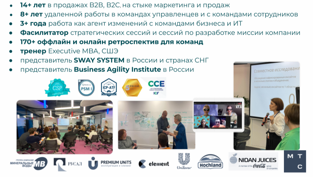 Полноценная работа с командой ( 1-3 созвона) в неделю, анализ компании и ее проблем, поиск путей решения, обучение сотрудников и руководителей. Дополнительная практика в команде: митапы, мастермайнды, lean coffee, бизнес-игры